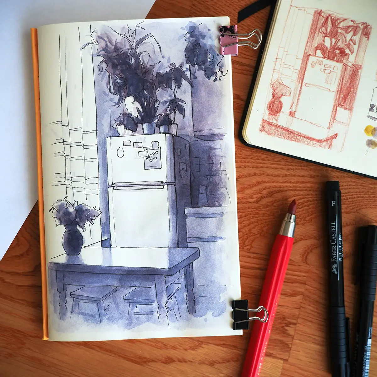 Un rincón de mi cocina iluminado por la luz del día. El punto central del boceto es una mesa de madera. Todavía puedo recordar las incontables veces que me reuní alrededor de esta mesa con mi familia y amigos para disfrutar de una taza de té o una comida. También usaba esta mesa para fotografiar mi obra artística y para cortar papel. Incluso hice mi primer cuaderno hecho a mano sobre ella.