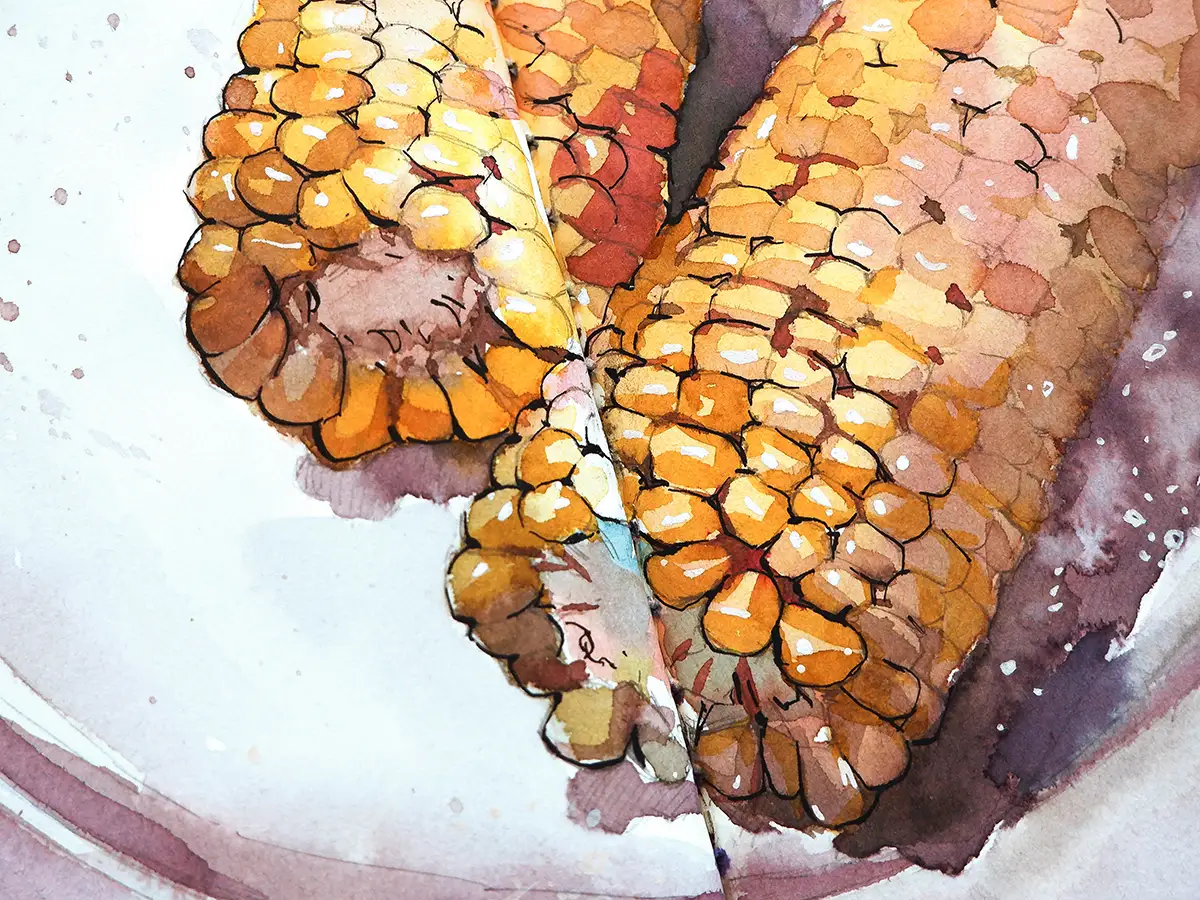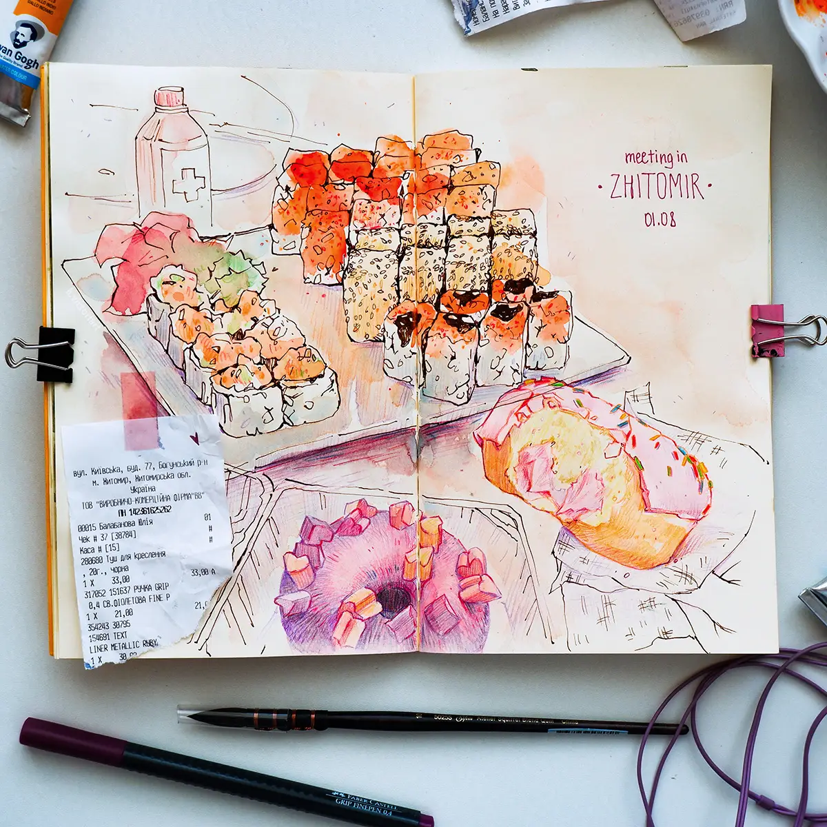 Este es un buen ejemplo de un boceto que no salió como esperaba, pero tiene un lugar especial en mi trayectoria artística. Marca el comienzo de mis experimentos mezclando lápices de colores y acuarelas - la técnica que uso mucho últimamente. Este boceto me recuerda el momento en que estaba almorzando con dos de mis amigos artistas durante la cuarentena. Al fondo se puede ver una pequeña botella de alcohol que llevaba conmigo para desinfectarme las manos.