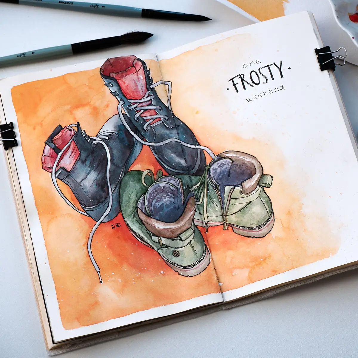Dos pares de zapatos que nos pertenecían a mí y a mi amiga. Este boceto me recuerda cuando vino a visitarme en invierno. El tiempo era frío y nevado, pero aun así lo pasamos genial juntas. El fondo naranja que añadí es especialmente apropiado porque me recuerda a la cálida luz que llena una habitación al atardecer.