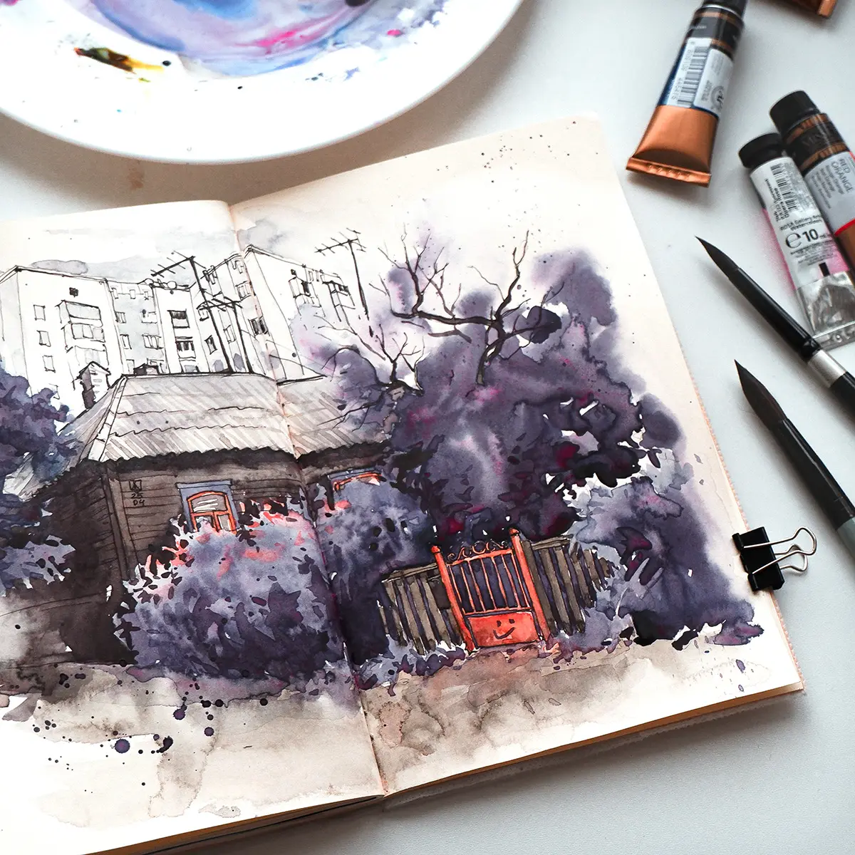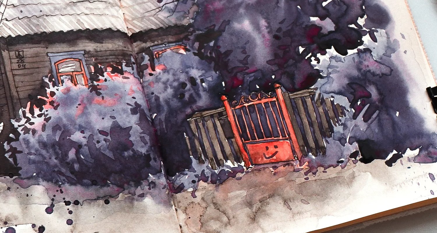 Solía ver esta amistosa verja desde la ventana del autobús casi todos los días de camino a casa desde la escuela de arte. Pinté este boceto y gané el "Reto de Un Suspiro" de Lena Sen en Instagram. Cambié los colores originales de la referencia a morado porque me inspiré en la película LomoChrome Purple de Lomography.