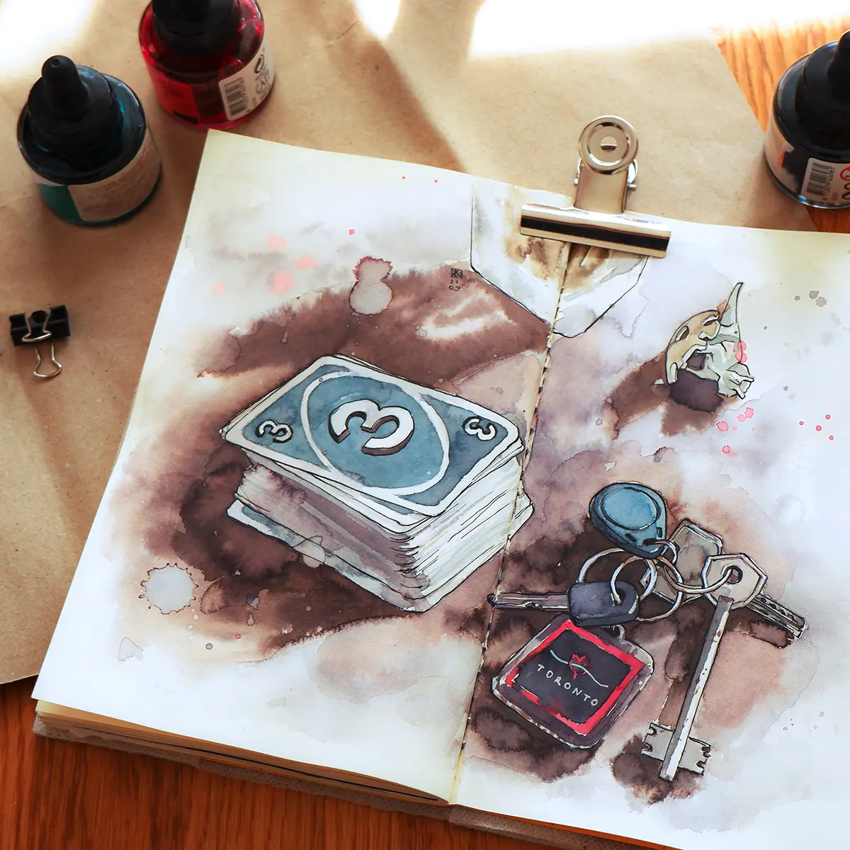 Este es el último boceto de mi diario visual, y muestra las llaves del piso que estaba alquilando y una baraja de cartas Uno. Le enseñé a mi sobrino a jugar al Uno, y desde entonces, cada vez que visitaba a mi hermana, me pedía que jugara con él. En el fondo del boceto también se puede ver una figurita de dinosaurio que mi sobrino sacó de un Kinder Sorpresa.