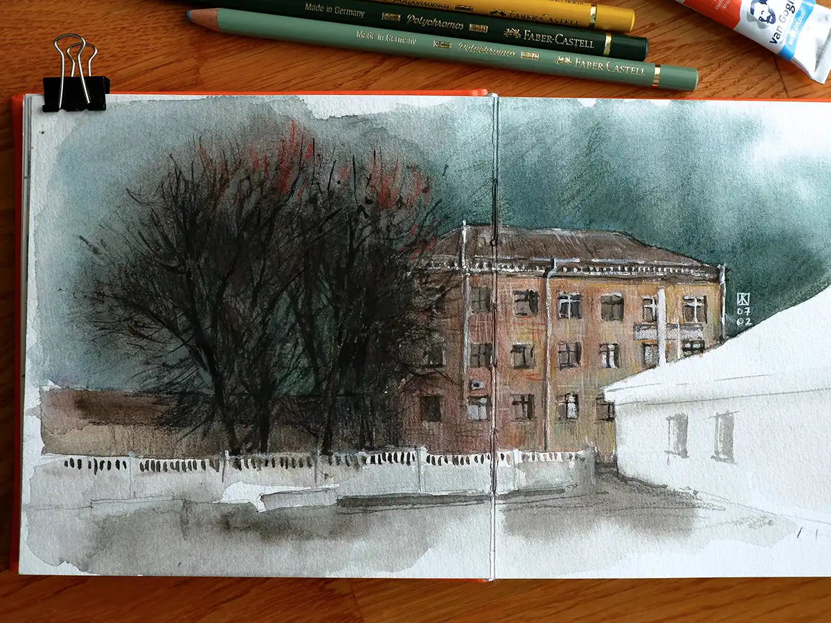 En 2020, empecé a planear mi mudanza a España. Así que se me ocurrió un pequeño proyecto personal para documentar los momentos cotidianos de mi vida en Ucrania - mi país natal. Comencé un diario visual en mi cuaderno, dibujando todo lo que captaba mi atención - desde pequeños momentos cotidianos hasta otros más significativos. Cada dibujo en mi cuaderno tiene una historia detrás, y hojearlo ahora se siente como viajar en el tiempo.